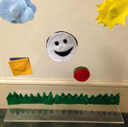 Next, we prototyped a simple sheet of transparent acrylic on a small stand. Kids could use wet erase markers to draw on the artboard and stick laser-cut vinyl shapes to the screen. We created felt shapes with magnets inside to encourage collaboration; the magnets would only stick if both children applied them together.